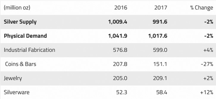 《全球金属数据》显示,2017年,由于矿山和废钢的供应量下降,全球白银供应量下降2%至不到10亿盎司,但白银需求受到全球经济增长和工业需求上升的支撑,其中,工业制造、珠宝、银器对白银的需求分别增长4%,2%、12%。